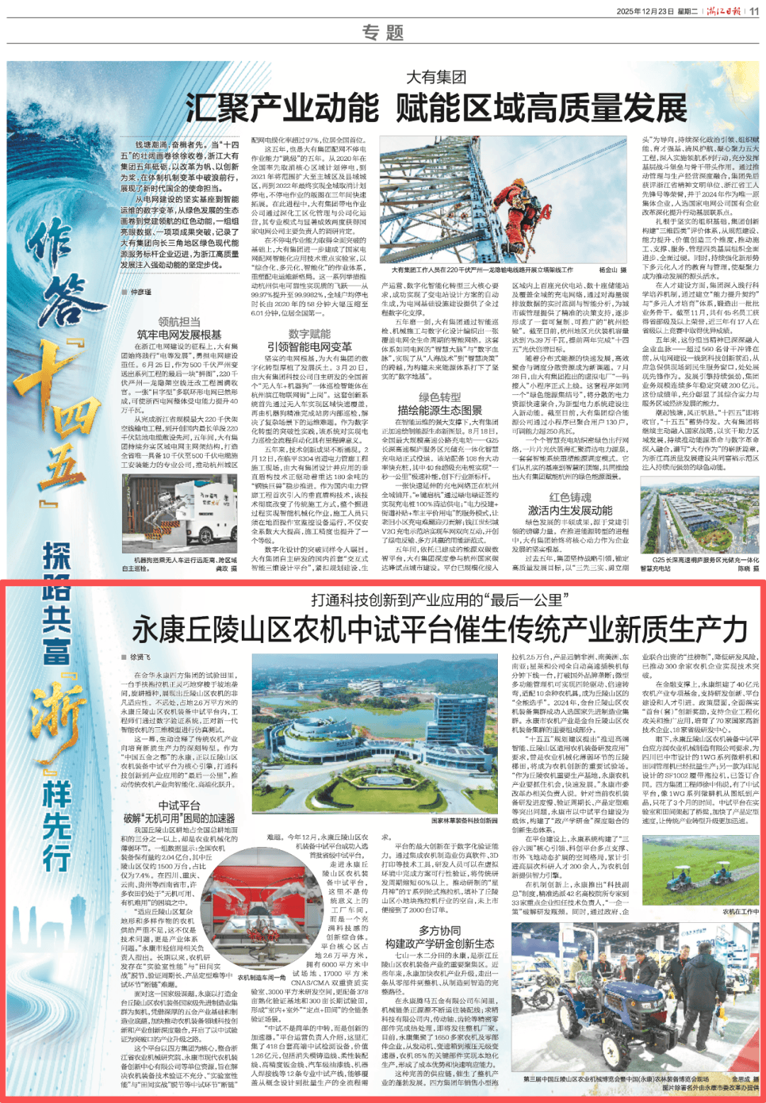 具有6000平方米中试场地、17000平方米CNAS/CMA双沉天分尝试室、3000平方米研发空间,占比仅为7.4%。研发人员能够正在虚拟中完成方案可行性验证,精准选派42名高校院所专家到33家沉点企业担任手艺担任人,走出一条从零部件到零件、从制制到智制的完整径。金台丘陵山区农机配备集群成功入选国度先辈制制业集群。机械链条正络绎不绝运往拆卸线;即将发往零件厂家。正对新一代智能农机的三维模子进行仿实测试。构成“室内+室外”“定点+田间”的全链条验证场景。正在金华永康四方集团的试验田里,浙江日报刊发《打通科技立异到财产使用的“最初一公里” 永康丘陵山区农机中试平台催生保守财产新质出产力》一文。